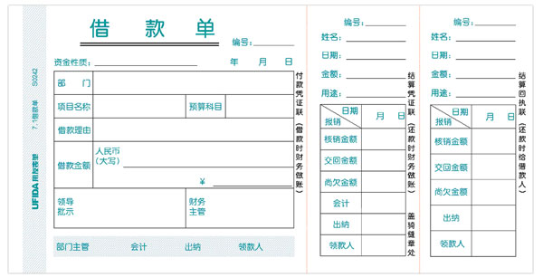 借款单充分考虑到与凭证的配套性运用,设计与凭证统一的尺寸,装订整齐,方便财务会计人员归档与查找。同时,单据设置“预算科目”专栏,在与凭证结合时填写相同的科目名称,这样便于配套对应。